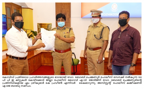 കോഴിക്കോട്: കോവിഡ് പ്രതിരോധ പ്രവര്ത്തനങ്ങളുടെ ഭാഗമായി ഡോ. ബോബി ചെമ്മണൂര് പോലീസ് സേനക്ക് 100 പി പി ഇ കിറ്റുകള് കൈമാറി. കോഴിക്കോട് ജില്ലാ പോലീസ് മേധാവി എ.വി. ജോര്ജിന് ഡോ. ബോബി ചെമ്മണൂരിന്റെ പ്രതിനിധികളായ എം ശ്രീകുമാര്, കെ പ്രവീണ് എന്നിവര് ചേര്ന്ന് കിറ്റുകള് കൈമാറി. കമ്മീഷണര് ഓഫീസില് വച്ചുനടന്ന ചടങ്ങില് അസിസ്റ്റന്റ് പോലീസ് കമ്മീഷണര് എ ജെ ബാബുവും സംബന്ധിച്ചു. കേരളത്തിന്റെ വിവിധ ഭാഗങ്ങളില് കിറ്റുകള് വിതരണം ചെയ്യുമെന്ന് ഡോ. ബോബി ചെമ്മണൂര് അറിയിച്ചു.
