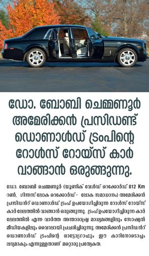 അമേരിക്കന് പ്രസിഡന്റ് ഡൊണാള്ഡ് ട്രംപ് ഉപയോഗിച്ചിരുന്ന റോള്സ് റോയ്സ് ലേലത്തില് പിടിക്കാനൊരുങ്ങി വ്യവസായി ബോബി ചെമ്മണ്ണൂര്. പ്രസിഡന്റ് സ്ഥാനം ഒഴിയുന്നതോടെ തന്റെ ആഡംബര വാഹനവും ട്രംപ് വില്ക്കാന് ഒരുങ്ങുകയാണെന്നാണ് റിപ്പോര്ട്ടുണ്ടായിരുന്നു. ലേലത്തില് പങ്കെടുക്കാന് ഒരുങ്ങുന്നതായി ബോബി ചെമ്മണ്ണൂര് തന്നെയാണ് സമൂഹമാധ്യമങ്ങളില് അറിയിച്ചത്. ഡൊണാള്ഡ് ട്രംപിന്റെ ഓട്ടോഗ്രാഫും കാറിനൊപ്പം ലഭിക്കുമെന്നും റിപ്പോര്ട്ടുണ്ട്. അമേരിക്കയുടെ 45-ാം പ്രസിഡന്റായി ഡൊണാള്ഡ് ട്രംപ് സ്ഥാനമേല്ക്കുന്നത് വരെ അദ്ദേഹം ഉപയോഗിച്ചിരുന്ന വാഹനമാണിത്.