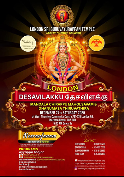 ലണ്ടന് ശ്രീ ഗുരുവായൂരപ്പ സേവാ സംഘവും മോഹന്ജി ഫൗണ്ടേഷനും ചേര്ന്ന് ലണ്ടന് ദേശവിളക്ക്, മണ്ഡലച്ചിറപ്പ് മഹോത്സവം, ധനുമാസ തിരുവാതിരയും സംഘടിപ്പിക്കുന്നു. ഡിസംബര് 27 ശനിയാഴ്ച വൈകുന്നേരം 5 മണി മുതല് ലണ്ടനിലെ തൊണ്ടണ് ഹീത്തിലുള്ള വെസ്റ്റ് തൊണ്ടണ് കമ്മ്യൂണിറ്റി സെന്ററില് വച്ചാണ് ദേശവിളക്ക് നടത്തുന്നത്. അന്നേ ദിവസം തത്വമസി യുകെ, ശ്രീ ഗുരുവായൂരപ്പ സേവാ സംഘം എന്നിവയുടെ നേതൃത്വത്തില് ഉള്ള ഭജന. ഗുരുവായൂരപ്പ സേവാ സംഘം അവതരിപ്പിക്കുന്ന തിരുവാതിരകളി,ശേഷം പ്രതേക വഴിപാടായ നീരാഞ്ജനം, തുടര്ന്ന് ദീപാരാധന, പടിപൂജ, സമൂഹ ഹരിവരാസനവും ശേഷം അന്നദാനവും ഉണ്ടായിരിക്കുന്നതാണ്.