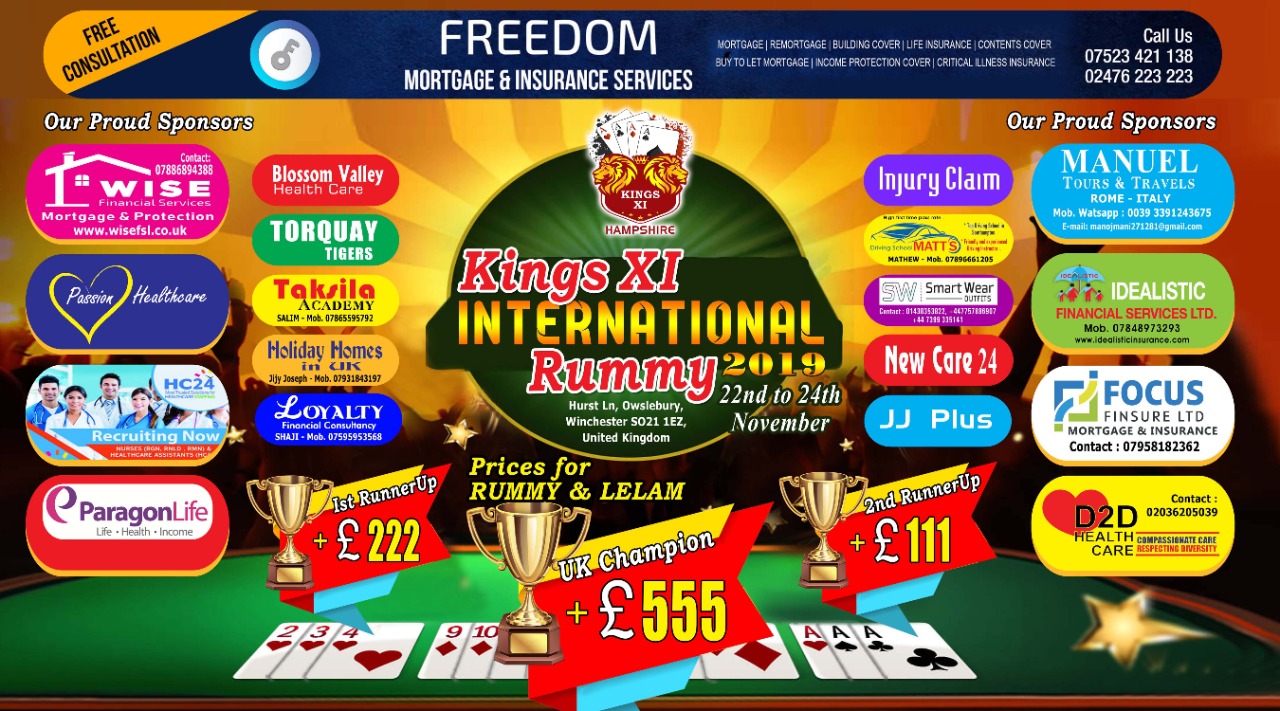 റമ്മി,ലേലം ഇനങ്ങളിലായിരിക്കും വാശിയേറിയ മല്സരം. ഓരോ ഇനത്തിലും ഒന്നാം സ്ഥാനം നേടുന്ന ടീമിന് 555 പൗണ്ടും രണ്ടാം സ്ഥാനം നേടുന്ന ടീമിന് 222 പൗണ്ടും മൂന്നാം സ്ഥാനം നേടുന്ന ടീമിന് 111 പൗണ്ടും സമ്മാനമായി നല്കുന്നുണ്ട്. ഹാംഷെയര് കിങ്സ് ഇലവന് ഇന്റര്നാഷണലാണ് മല്സരം സംഘടിപ്പിക്കുന്നത്. 2015 മുതല് യു.കെ.യുടെ വിവിധ ഭാഗങ്ങളില് വച്ച് സംഘടിപ്പിക്കുന്ന ചീട്ടുകളി