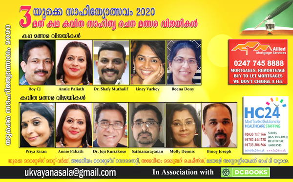 മൂന്നാമത് യുകെ സാഹിത്യോല്സവവും കോട്ടയം ഡി സി ബുക്സുമായി സഹകരിച്ച് നടത്തിയ മൂന്നാമത് യുകെ കഥ കവിത രചനാ മത്സരത്തിന്റെ വിജയികള്ക്കുള്ള സമ്മാനദാനവും ഫെബ്രുവരി 22നു രാവിലെ 11 മുതല് ലണ്ടനിലെ 'മലയാളി അസോസിയേഷന് ഓഫ് യൂകെ'യുടെ (MAUK)മാനര് പാര്ക്കിലെ റോംഫോര്ഡ് റോഡിലെ കേരള ഹൌസില് വെച്ച് നടത്തപ്പെടുന്നു.