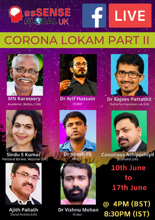 മാനവികതയും ശാസ്ത്രചിന്തയും പ്രചരിപ്പിക്കുന്ന എസ്സെന്സ് ഗ്ലോബല് യുകെ പ്രഗല്ഭരെ അണിനിരത്തികൊണ്ട് കൊറോണ ലോകം - 2 എന്ന സൈബര് മീറ്റ് വീണ്ടും ഒരുക്കുന്നു , ജൂണ് 10 മുതല് 17 വരെ. കൊറോണ ലോകം എന്ന സൈബര് മീറ്റ് ഒന്നിന്റെ വന് വിജയത്തെ തുടര്ന്നാണ് രണ്ടാം ഭാഗം ആരംഭിക്കുന്നത്. പത്താം തിയതി മുതല് പതിനേഴാം തിയതി വരെ നടത്തുന്ന സൈബര് മീറ്റില് ആസ്ട്രേലിയ , യുകെ , ഇന്ത്യ എന്നിവടങ്ങളില് നിന്നുള്ള പ്രഗത്ഭര് കൊറോണയുമായി ബന്ധപ്പെട്ട വിവിധ വിഷയങ്ങളില് പ്രബോധനങ്ങള് നടത്തുന്നു .