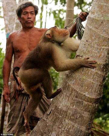 അവന്റെ ശരീരം തേങ്ങാക്കുലയെക്കാള് ചെറുതാണ്. പക്ഷേ ഓരോന്നിനെയും അതിന്റെ കുലയില് നിന്ന് വളച്ചൊടിച്ച് നിലത്തേക്ക് വീഴാന് തന്റെ ശക്തി എങ്ങനെ ഉപയോഗിക്കാമെന്ന് അവ പഠിച്ചു, 'അടുത്തത്, അടുത്തത്, അടുത്തത്...' എന്ന നിര്ദ്ദേശം അനുസരിച്ചു തേങ്ങകള് താഴെ വീഴിക്കുന്നു 315 മില്യണ് പൗണ്ട് വരുന്ന തായ് നാളികേര പാല് വിപണിയിലെ 'അടിമ തൊഴിലാളി'കളാണ് ഇവ. ഈ വിപണിയിലെ എട്ട് ശതമാനവും യുകെയിലേക്കാണ് .