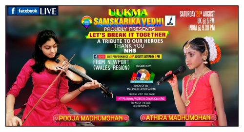 യുക്മ സാംസ്കാരിക വേദിയുടെ ആഭിമുഖ്യത്തില്, കോവിഡ് 19 ന് എതിരായ പ്രവര്ത്തനങ്ങള്ക്ക് മുന്നിരയില് നില്ക്കുന്ന ലോകം മുഴുവനുമുള്ള ആരോഗ്യ പ്രവര്ത്തകര്ക്ക് പിന്തുണയും ആദരവും അര്പ്പിച്ച് കൊണ്ടുള്ള ലൈവ് ടാലന്റ് ഷോ 'LET'S BREAK IT TOGETHER' ല് നാളെ(ശനി) 5 PM ന് (ഇന്ഡ്യന് സമയം രാത്രി 9.30) എത്തുന്നത് വെയില്സിലെ ന്യൂപോര്ട്ടില് നിന്നുള്ള പൂജ മധുമോഹന്, ആതിര മധുമോഹന് എന്നീ സഹോദരിമാരാണ്.