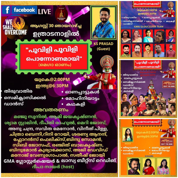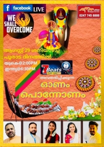 ഉച്ചകഴിഞ്ഞ് യുകെ സമയം രണ്ടുമണിമുതല് (ഇന്ത്യന് സമയം 6:30) WE SHALL OVERCOME പേജില് 'ഓണം പൊന്നോണം' ആസ്വദിക്കാം. രണ്ടാം ദിവസമായ നാളെ (ഞായറാഴ്ച) ഉത്രാട നാളില് യുകെയിലെ വിവിധ അസോസിയേഷനുകളില് നിന്നുള്ള ഗായകരും, നര്ത്തകരും, മറ്റു കലാ പ്രവര്ത്തകരും ചേര്ന്നവതരിപ്പിക്കുന്ന വ്യത്യസ്തങ്ങളായ കലാപരിപാടികള് 'പൂവിളി പൂവിളി പൊന്നോണമായി'. കൊച്ചിന് കലാഭവന് സെക്രട്ടറിയും മിമിക്രി താരവുമായ കെ എസ് പ്രസാദ് മുഖ്യാതിഥിയായി പങ്കെടുക്കും.