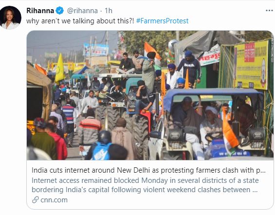 റിഹാനയെന്ന പേര് ഇന്ത്യയിലെ പാവപ്പെട്ട കര്ഷകര് കേട്ടിട്ടില്ല. ഇതാരാണ് എന്ന് ഇന്റര്നെറ്റില് തിരയാമെന്ന് വച്ചാല് കര്ഷകര് സമരം ചെയ്യുന്ന വേദികളില് ഇന്റര്നെറ്റില്ല. എന്നാല് കാണാമറയത്തിരുന്ന് ഇന്ത്യയിലെ കര്ഷകര്ക്ക് വേണ്ടി എഴുതിയ ഒറ്റവരി ലോകം ഏറ്റെടുത്തിരിക്കുകയാണ്. കനേഡിയന് പ്രധാനമന്ത്രി ജസ്റ്റിന് ട്രുഡോ ഇതുപോലൊരു അഭിപ്രായപ്രകടനം നടത്തിയതിന് ഇന്ത്യ ന്യൂദല്ഹിയിലെ കനേഡിയന് അംബാസിഡറെ വിളിച്ചു വരുത്തിയിരുന്നു. ഇന്ത്യയുടെ ആഭ്യന്തരകാര്യങ്ങളില് ഇടപെടരുത് എന്ന മുന്നറിപ്പും നല്കി. ട്രൂഡോയ്ക്ക് മാത്രമല്ല എല്ലാ ലോകനേതാക്കള്ക്കുമുള്ള ഒരു താക്കീതായിരുന്നു അത്. ഇന്ത്യയുടെ കണ്ണുരുട്ടലില് എല്ലാവരും തന്നെ വിരണ്ടു. കാനഡയുടെ പാത മറ്റു ലോക രാജ്യങ്ങള് പിന്തുടരാത്തതിന് പിന്നില് മറ്റൊന്നുമല്ല. ലോകത്തിലെ ഏറ്റവും വലിയ മാര്ക്കറ്റായ ഇന്ത്യയെ പിണക്കി എന്തിന് കച്ചവടം പൂട്ടുന്നു എന്നാണ് പൊതുവേ ലോകരാജ്യങ്ങളും രാഷ്ട്രീയ നേതാക്കളും ചിന്തിക്കുന്നത്.
