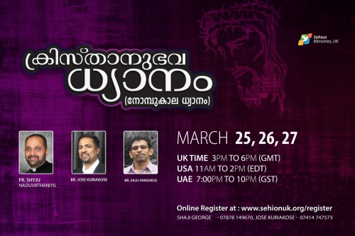 വലിയ നോമ്പിനോടനുബന്ധിച്ച് വ്രതാനുഷ്ഠാനത്തിന്റെ പരിശുദ്ധിയും , പുനഃരുത്ഥാനത്തിന്റെ സുവിശേഷവും പ്രഘോഷിച്ചുകൊണ്ട് , ക്രിസ്താനുഭവത്തില് നിറഞ്ഞ് , ദൈവിക സംരക്ഷണയില് വളരുകയെന്ന ലക്ഷ്യത്തോടെ സെഹിയോന് മിനിസ്ട്രിയുടെ നേതൃത്വത്തില് മൂന്നുദിവസത്തെ നൊയമ്പുകാല ധ്യാനം മാര്ച്ച് 25,26,27 തീയതികളില് ഓണ്ലൈനില് നടക്കുന്നു . സെഹിയോന് യുകെ ഡയറക്ടറും പ്രശസ്ത ആധ്യാത്മിക ശുശ്രൂഷകനുമായ ഫാ.ഷൈജു നടുവത്താനിയില് ധ്യാനം നയിക്കും .