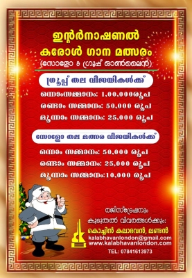 കരോള് ഗാന മത്സരത്തിന് വിവിധ രാജ്യങ്ങളില് നിന്നും മികച്ച പ്രതികരണമാണ് ലഭിച്ചുകൊണ്ടിരിക്കുന്നത്. മലയാളം ഉള്പ്പെടെയുള്ള ഏതു ഭാഷയിലുള്ള കരോള്വേണ്ടിയാണിത്. ഗാനങ്ങളും ആലപിക്കാം. സോളോ, ഗ്രൂപ്പ് തലങ്ങളില് ആണ് മത്സരങ്ങള്. ഏതു രാജ്യത്തു നിന്നുള്ളവര്ക്കും മത്സരത്തില് പങ്കെടുക്കാം. ഭാഷ/രാജ്യ /വയസ്സ് / ആണ് / പെണ് വ്യത്യാസങ്ങള് ഇല്ല. ഡിസംബര് 22 വരെ രജിസ്ട്രേഷന് സ്വീകരിക്കുന്നതാണ്, റെക്കോഡ് ചെയ്ത വിഡിയോകള് ഡിസംബര് 30 വരെയും സ്വീകരിക്കുന്നതാണ്.വിജയികളാകുന്നവര്ക്ക് ക്യാഷ് അവാര്ഡുകളും കലാഭവന് ലണ്ടന് സര്ട്ടിഫിക്കറ്റുകളും ലഭിക്കും. മത്സരത്തില് പങ്കാളികളാകുന്നവരെല്ലാം കലാഭവന് ലണ്ടന്റെ സര്ട്ടിഫിക്കറ്റിന് അര്ഹരായിരിക്കും.
