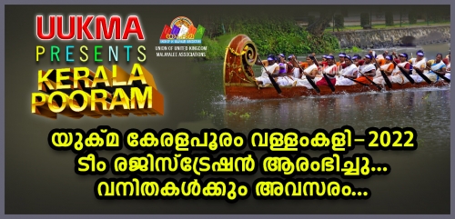 യുക്മ (യൂണിയന് ഓഫ് യു.കെ മലയാളി അസോസിയേഷന്സ്) ജനകീയ പങ്കാളിത്തത്തോടെ നടത്തുന്ന 'കേരളാ പൂരം 2022'നോട് അനുബന്ധിച്ചുള്ള വള്ളംകളി മത്സരത്തിന് ടീം രജിസ്ട്രേഷന് അപേക്ഷകള് ക്ഷണിക്കുന്നതായി ഇവന്റ് ഓര്ഗനൈസര് അഡ്വ. എബി സെബാസ്റ്റ്യന് അറിയിച്ചു.