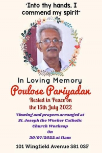 മകനൊപ്പം അവധിക്കാലം ചെലവിടാന് എത്തി നോട്ടിങ്ഹാമില് മരണമടഞ്ഞ ചാലക്കുടി സ്വദേശിയുടെ പൊതുദര്ശനം 30ന് നടത്തുമെന്ന് ബന്ധുക്കള് അറിയിച്ചു. ഏക മകനൊപ്പം താമസിക്കാന് എത്തിയ ചാലക്കുടി ചട്ടിക്കുളം സ്വദേശിയായ പൗലോസി(72)നെ രണ്ട് ദിവസം മുമ്പാണ് ആകസ്മിക മരണം തേടിയെത്തിയത്. നോട്ടിങ്ഹാംഷെയറിലെ വെര്സോപ്പില് താമസിക്കുന്ന രാജ് പോളിന്റെ പിതാവാണ് പൗലോസ്. പൗലോസിന്റെ പൊതുദര്ശനം പ്രാര്ത്ഥനയും സെന്റ് ജോസഫ് വര്ക്കര് കാത്തലിക് ചര്ച്ചിലാണ് നടക്കുക. രാവിലെ 11 മണിക്കാണ് പൊതുദര്ശന സമയം.