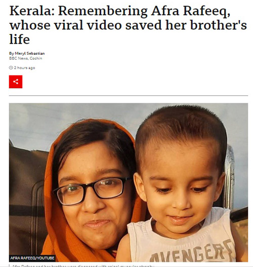 സ്പൈനല് മസ്കുലര് അട്രോഫി (എസ്എംഎ) രോഗബാധിതയായിരുന്ന കണ്ണൂര് മാട്ടൂല് സ്വദേശിയായ 13 വയസുകാരി അഫ്ര റഫീഖിന്റെ ത്യാഗം പ്രകീര്ത്തിച്ചു ബിബിസി. തന്റെ രോഗാവസ്ഥയിലുള്ള ഇളയസഹോദരന് മുഹമ്മദിന്റെ ജീവന് രക്ഷിക്കാനായി വീല് ചെയറിലിരുന്ന് സഹായ അഭ്യര്ത്ഥന നടത്തിയതിനെ തുടര്ന്ന് അഫ്ര ജനശ്രദ്ധ നേടിയിരുന്നു.