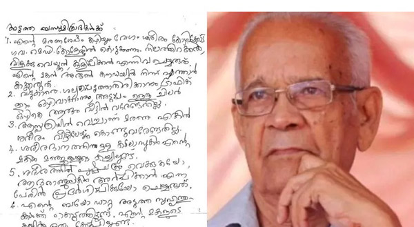 കാനഡയിലുള്ള മകന് എത്തും വരെ കാത്തു നില്ക്കേണ്ടതില്ലെന്ന് എഴുതിയിരുന്നെങ്കിലും അദ്ദേഹത്തിന്റെ ആരോഗ്യ നില മോശമായതോടെ ഞായറാഴ്ച അരുണ് നാട്ടിലെത്തിയിരുന്നു. മരണ ശേഷം മോര്ച്ചറിയിലേക്ക് മാറ്റിയ അദ്ദേഹത്തിന്റെ മൃതദേഹം ചൊവ്വാഴ്ച മെഡിക്കല് കോളേജിലേക്ക് കൊണ്ടുപോയി.