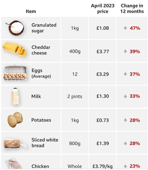 ഏപ്രിലില് യുകെയില് ഭക്ഷ്യവിലകള് 45 വര്ഷത്തിനിടയിലെ ഏറ്റവും വേഗതയേറിയ നിരക്കില് കുതിച്ചു, പഞ്ചസാര, പാല്, പാസ്ത തുടങ്ങിയ പ്രധാന വിഭവങ്ങളുടെ വില കുത്തനെ ഉയര്ന്നു. ഏപ്രില് വരെയുള്ള വര്ഷത്തില് പലചരക്ക് സാധനങ്ങളുടെ വില വര്ധിച്ച നിരക്ക് നേരിയ തോതില് കുറഞ്ഞെങ്കിലും 19.1% എന്നത് റെക്കോര്ഡ് ഉയരത്തിന് അടുത്താണ്.