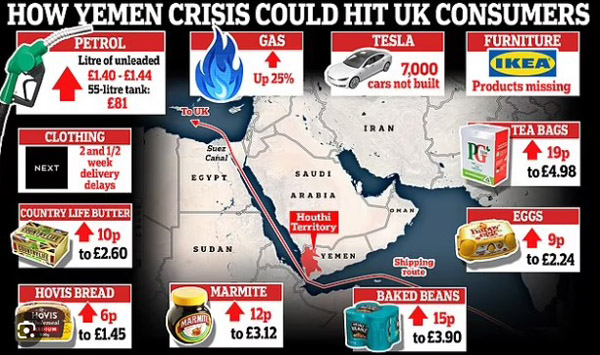 യുക്രെയിന്- റഷ്യന് യുദ്ധം സൃഷ്ടിച്ച ആഘാതത്തില് നിന്നും മുക്തി നേടുന്നതിനു മുന്പ് തന്നെ ബ്രിട്ടന് ആഘാതമായി ചെങ്കടലിലെ സംഘര്ഷം. ഇത്തവണ ചെങ്കടലില് വാണിജ്യ കപ്പലുകള്ക്ക് നേരെ ആക്രമണം നടത്തുന്ന ഹൂതികളാണ് യുകെയ്ക്കു തിരിച്ചടി നല്കുന്നത്. സംഘര്ഷം അവശ്യ സാധനങ്ങള്ക്ക് വില കുതിച്ചുയരാന് ഇടയാക്കിയിരിക്കുകയാണ്. ബ്രഡ്, ബട്ടര്, ടീബാഗുകള് എന്നിവയുടെ മാത്രമല്ല, പ്രകൃതിവാതകത്തിന്റെ വിലയും കുതിച്ചുയരുകയാണ്.