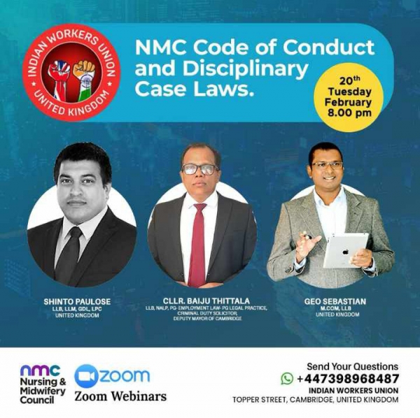 യുണൈറ്റഡ് കിങ്ഡം ഇന്ത്യന് വര്ക്കേഴ്സ് യൂണിയന് 'എന്എംസി കോഡ് ഓഫ് കോണ്ടക്ട് ആന്റ് ഡിസിപ്ലിനറി കേസ് ലോസ്' വെബ്ബിനാര് 20ന് സൂം പ്ലാറ്റ് ഫോമില് വൈകിട്ട് എട്ടു മണിയ്ക്ക് നടക്കും.