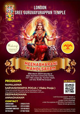ലണ്ടന് ഹിന്ദു ഐക്യവേദിയുടെ നേതൃത്വത്തില് ഈ മാസത്തെ സത്സംഗം മീനഭരണി മഹോത്സവം 30ന് (ശനിയാഴ്ച) ക്രോയിഡോണിലെ വെസ്റ്റ് തോണ്ടണ് കമ്മ്യൂണിറ്റി സെന്ററില് വച്ച് വൈകിട്ട് ആറു മണി മുതല് നടത്തുവാന് നിശ്ചയിച്ചിരിക്കുന്നു.
