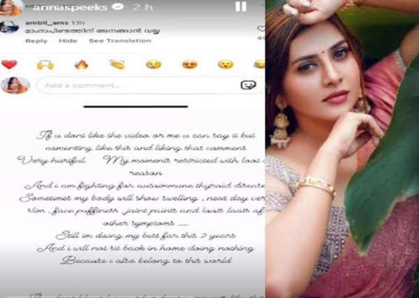 തന്റെ രോഗത്തെ കുറിച്ച് വെളിപ്പെടുത്തിയാണ് ഒരു കമന്റിന് താഴെ അന്ന പ്രതികരിച്ചിരിക്കുന്നത്. അന്ന ഡാന്സ് ചെയ്യുന്ന വീഡിയോക്ക് താഴെയാണ് താരത്തെ അപമാനിച്ചു കൊണ്ട് ‘മാംസപിണ്ഡത്തിന് അനങ്ങാന് വയ്യ’ എന്ന കമന്റ് വന്നത്. ഈ കമന്റിന് മറുപടി ആയാണ് തനിക്ക് തൈറോയിഡ് ആണെന്നും അതുകൊണ്ടാണ് തടിച്ചും മെലിഞ്ഞും ഒക്കെ ഇരിക്കുന്നതെന്നും നടി പറയുന്നത്.