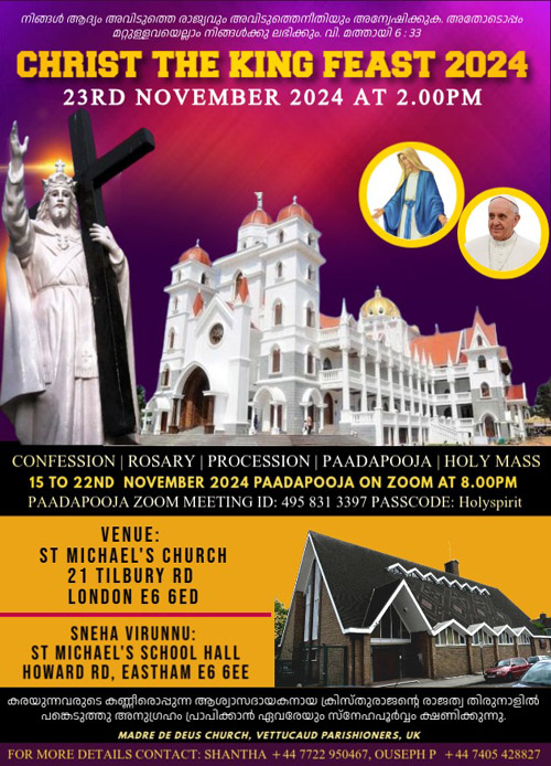 ഈ വര്ഷത്തെ ക്രിസ്തു നാഥന്റെ രാജത്വ തിരുന്നാള് നവംബര് 23 ശനിയാഴ്ച ഉച്ചക്ക് 2 ന് ഈസ്റ്റ് ഹാമിലെ St. Michaels' ദൈവാലയത്തില് വെച്ച് ഭക്ത്യാദര പൂര്വം ആഘോഷിക്കും.