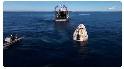 ഇന്ത്യന് സമയം ഇന്ന് പുലര്ച്ചെ 2.41ന് ഡീഓര്ബിറ്റ് ബേണ് പ്രക്രിയയിലൂടെ വേഗം കുറച്ച് ഭൂമിയുടെ അന്തരീക്ഷത്തിലേക്ക് ഡ്രാഗണ് പേടകം പ്രവേശിച്ചു. തുടര്ന്ന് പാരച്ചൂട്ടുകളുടെ സഹായത്തോടെ സ്ഥിരവേഗം കൈവരിച്ച പേടകം സുരക്ഷിതമായി കടലില് പതിച്ചു. അറ്റ്ലാന്റിക് സമുദ്രത്തില് പതിച്ച പേടകം റിക്കവറി ടീം ക്രെയ്നന് ഉപയോഗിച്ച് ഉയര്ത്തി കപ്പലിലേക്ക് മാറ്റി. തുടര്ന്ന് പേടകത്തിനുള്ളില് നിന്ന് ഓരോ യാത്രികരെയും പുറത്തെത്തിക്കുകയായിരുന്നു.