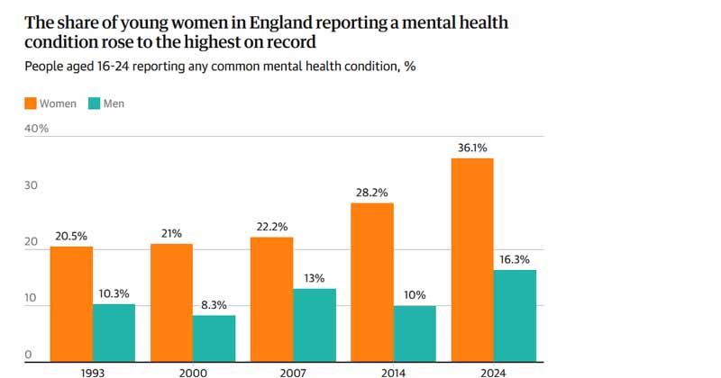 യുവാക്കളെക്കാള് യുവതികളിലാണ് മാനസിക പ്രശ്നങ്ങള് കൂടുതല് ഉള്ളത്. 16 മുതല് 24 വയസ് വരെ പ്രായമുള്ളവരില് ഇത്തരം അവസ്ഥകളുടെ നിരക്ക് ഒരു ദശാബ്ദത്തിനുള്ളില് വലിയ തോതില് വര്ധിച്ചതായി ആണ് സര്വേ ഫലം കാണിക്കുന്നത്. 2014 -ല് ഇത്തരം പ്രശ്നങ്ങള് ഉള്ളവരുടെ എണ്ണം 18.9 ശതമാനമായിരുന്നത് 2024 ആയപ്പോള് 25.8 ശതമാനമായി ഉയര്ന്നു. എന്നാല് മുതിര്ന്ന സ്ത്രീകളില് പാനിക് ഡിസോര്ഡര്, ഫോബിയകള്, ഒബ്സസീവ് കംപള്സീവ് ഡിസോര്ഡര് എന്നിവയും ഉള്പ്പെടുന്ന പ്രശ്നബാധിതരുടെ എണ്ണവും വളരെ കൂടിയിട്ടുണ്ട്. 36. 1 ശതമാനം സ്ത്രീകള് ആണ് ഈ മാനസിക പ്രശ്നങ്ങള് നേരിടുന്നതെന്ന് സര്വേയിലെ പ്രധാന ഗവേഷകരിലൊരാളായ സാലി മക്മാനസ് പറയുന്നു.