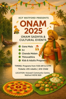 വാട്ഫോര്ഡ് മലയാളികളുടെ സൗഹൃദവേദിയായ കെസിഎഫ്ന്റെ തിരുവോണ ആഘോഷവും, കലാപരിപാടികളും, ഗംഭീര ഓണസദ്യയും ആസ്വദിക്കുവാന് ഏവരെയും സസ്നേഹം സ്വാഗതം ചെയ്യുന്നു. ഓണാഘോഷത്തില് പങ്കു ചേരുവാന് ആഗ്രഹിക്കുന്നവര് പ്രവേശനം ഉറപ്പാക്കുവാന് മുന്കൂട്ടി തന്നെ സീറ്റ് റിസര്വ്വ് ചെയ്യേണ്ടതാണ്.