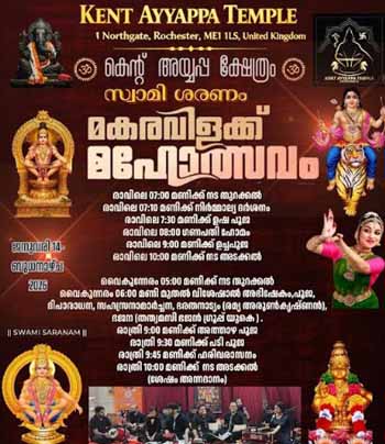 റോച്ചസ്റ്റര്, കെന്റ്: ഇംഗ്ലണ്ടിലെ കെന്റ് അയ്യപ്പ ക്ഷേത്രത്തില് ജനുവരി 14ബുധനാഴ്ച മകരവിളക്ക് മഹോത്സവം ഭക്ത്യാദരപൂര്വം ആഘോഷിക്കുന്നു. അയ്യപ്പ ഭക്തര്ക്കായി സമ്പൂര്ണമായ പൂജാ-ആചാരങ്ങളും സാംസ്കാരിക പരിപാടികളും സംഘടിപ്പിച്ചിരിക്കുന്നു