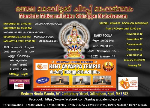 കെന്റ് അയ്യപ്പക്ഷേത്രം ഈ വര്ഷവും മണ്ഡല മകരവിളക്ക് ചിറപ്പ് മഹോത്സവം ശരണം വിളികളോടെ, 15 മുതല് 2022, ജനുവരി 14 വരെ, ഭക്തിപൂര്വ്വം ആചരിക്കുന്നു. കെന്റിലെ Medway ഹിന്ദു മന്ദിറില് വച്ചാണ് പൂജകള് നടത്തപ്പെടുന്നത്. നവംബര് 15, 20, 27, ഡിസംബര് 4, 11, 18, ജനുവരി (2022) 1, 8 എന്നീ ദിവസങ്ങളില് വിശേഷാല് അയ്യപ്പ പൂജ വൈകുന്നേരം 5 മണി മുതല് നടത്തപ്പെടുന്നു. നവംബര് 16നു രാവിലെ 5 മണിക്ക് വൃശ്ചികം 1 തിരുനട തുറപ്പും ഗണപതിഹോമവും ഉണ്ടായിരിക്കുന്നതാണ്. നവംബര് 15നു വിശേഷാല് അയ്യപ്പപൂജയും ഡിസംബര് 26നു മണ്ഡലപൂജയും ജനുവരി (2022) 14നു മകരവിളക്ക് മഹോത്സവവും നടത്തപെടുന്നതാണ്. മേല്പറഞ്ഞ ദിവസങ്ങളിലൊഴികെ എല്ലാ ദിവസവും വൈകുന്നേരം 7 മണി മുതല് 8 മണി വരെ അയ്യപ്പപ്പപൂജയും ഭജനയും നടത്തുന്നു. വിശേഷാല് അയ്യപ്പപൂജയോടനുബന്ധിച്ചു ഭജന, വിളക്കുപൂജ, നെയ്യഭിഷേകം, താലപ്പൊലി, സഹസ്രനാമാര്ച്ചന, അഷ്ടോത്തര അര്ച്ചന, ശനിദോഷ പരിഹാരം (നീരാന്ജനം), ദീപാരാധന, പടിപൂജ, ഹരിവരാസനം, പ്രസാദവിതരണം, അന്നദാനം