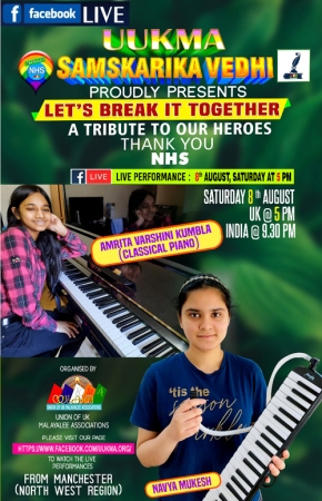 യുക്മ സാംസ്കാരിക വേദിയുടെ ആഭിമുഖ്യത്തില്, കോവിഡ് 19 ന് എതിരായ പ്രവര്ത്തനങ്ങള്ക്ക് മുന്നിരയില് നില്ക്കുന്ന ലോകം മുഴുവനുമുള്ള ആരോഗ്യ പ്രവര്ത്തകര്ക്ക് പിന്തുണയും ആദരവും അര്പ്പിച്ച് കൊണ്ടുള്ള ലൈവ് ടാലന്റ് ഷോ 'LET'S BREAK IT TOGETHER' ല് ഇന്ന് ( ചൊവ്വ) 5 PM ന് (ഇന്ഡ്യന് സമയം രാത്രി 9.30) ആസ്വാദകര്ക്ക് മുന്നിലെത്തുന്നത് ആറ് അതുല്യ പ്രതിഭകളാണ്. എര്ഡിംഗ്ടണില് നിന്നുള്ള സഹോദരങ്ങളായ
