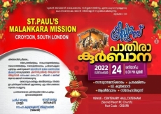 സൗത്ത് ലണ്ടന് ; ക്രോയിഡന് സെന്റ് പോള്സ് മലങ്കര കത്തോലിക്ക ദൈവാലയത്തില് ഈ വര്ഷത്തെ തിരുപ്പിറവി ശുശ്രൂഷകള്ക്ക് 24ന് തുടക്കം. ഇടവക വികാരി ഫാ കുര്യാക്കോസ് തിരുവാലില് അച്ചന്റെ കാര്മികത്വത്തില് ക്യാറ്റര് ഹാം ഓണ് ദി ഹില് സെനിട്ടറി ഹാളില് നടത്തുവാന് നിശ്ചയിച്ചിരിക്കുന്ന വിവരം ഇടവക ഭാരവാഹികള് അറിയിച്ചു.