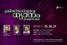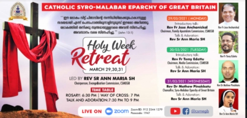 വലിയ നോയമ്പിലൂടെ ആര്ജ്ജിച്ചെടുക്കുന്ന കൃപാവരങ്ങളില് ശക്തിപ്പെടുവാനും, വിശുദ്ധവാരത്തിനായി ഒരുങ്ങുവാനും, വരുന്ന തിങ്കള്, ചൊവ്വ, ബുധന് ദിവസങ്ങളില് ഗ്രേറ്റ് ബ്രിട്ടണ് സീറോ മലബാര് രൂപത ധ്യാനം ഒരുക്കുന്നു.