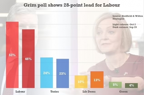 വിപണിയിലെ തകര്ച്ചയും, മോര്ട്ട്ഗേജ് ആശങ്കകളും വോട്ടര്മാരെ കണ്സര്വേറ്റീവുകള്ക്ക് എതിരാക്കി. ലേബര് പാര്ട്ടി 28 പോയിന്റ് ലീഡ് നിലനിര്ത്തുന്നതായി സര്വെകള് . വിപണിയില് തിരിച്ചടികള് നേരിടുകയും, മോര്ട്ട്ഗേജ് നിരക്കുകള് സകല നിയന്ത്രണങ്ങളും വിട്ട് കുതിക്കുകയും ചെയ്യുമെന്ന ഭീതി പരന്നതോടെ ലേബര് പാര്ട്ടിക്ക് വന്മുന്നേറ്റമാണ് സൃഷ്ടിക്കാന് കഴിഞ്ഞത്.