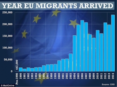 2014വരെ 3 മില്യണ് കുടിയേറ്റക്കാര് യുകെയിലെത്തി താമസം തുടങ്ങി. ഇവരില് ഭൂരിഭാഗവും 1990-2013 കാലഘട്ടത്തിലാണ് എത്തിയത്.ഇതില് 743000 പേര് പോളണ്ടില് നിന്നുമാണ്. ലിത്വാനിയ(134000), ഇറ്റലി(108000), അയര്ലന്ഡ്(108000) എന്നിങ്ങനെയാണ് .