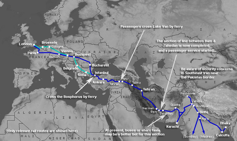 ട്രാന്സ് ഏഷ്യ എക്സ്പ്രസ് ട്രെയിന് വഴി ടെഹ്റാനില് നിന്ന് തുര്ക്കിയിലെ അങ്കാറയിലേക്ക് സഞ്ചരിക്കാം. മൂന്ന് ഭാഗമായി തിരിച്ചാണ് ഈ യാത്ര. ആദ്യം ടെഹ്റാനില് നിന്ന് തുര്ക്കിയിലെ വാന്പയെര് സ്റ്റേഷനിലേക്ക് എത്തുക. അവിടെ നിന്ന് വാന് തടാകം കടക്കാന് കപ്പല്/ ബോട്ട് സംവിധാനം ഉപയോഗിച്ചേ മതിയാകൂ. തടാകം കടന്നാല് അങ്കാറയിലേക്ക് നേരിട്ട് ബന്ധിപ്പിക്കുന്ന ട്രെയിന് സര്വീസ് ഉണ്ട്. അങ്കാറയില് നിന്ന് ഇസ്താംബൂളിലേക്ക് ആണ് പിന്നെ പോകേണ്ടത്. ഏറ്റവും സ്പീഡ് കൂടിയ ട്രെയിന് സര്വീസാണ് ഈ സ്ഥലങ്ങളെ തമ്മില് ബന്ധിപ്പിക്കുന്നത്. 533 കിലോമീറ്റര് ദൂരം താണ്ടാന് അഞ്ച് മണിക്കൂര് മതി.