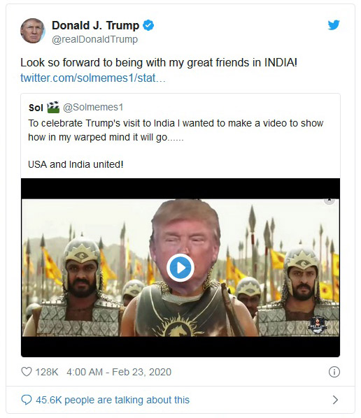 തന്റെ ഇന്ത്യന് സന്ദര്ശനത്തിന് മണിക്കൂറുകള് ശേഷിക്കുമ്പോഴാണ് ട്രംപ് ഇന്ത്യയിലെ തന്റെ സുഹൃത്തുക്കള്ക്കൊപ്പമെന്ന് ട്വീറ്റ് ചെയ്ത് വീഡിയോ പങ്കുവച്ചെത്. 'ബാഹുബലി' സിനിമയിലെ നായകന്റെ മുഖത്ത് ട്രംപിന്റെ മുഖം മോര്ഫ് ചെയ്തുവച്ചാണ് @Solmemes1 ട്വിറ്റര് ഉപയോക്താവ് വിഡിയോ നിര്മിച്ചിരിക്കുന്നത്.