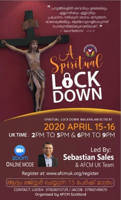 ലോകത്തെ ഭയാനകമാം വിധം ബാധിക്കുന്ന മഹാ വിപത്തുകളെ ദൈവിക പദ്ധതിയോട് ചേര്ന്നുനിന്നുകൊണ്ട് അഭിമുഖീകരിക്കുവാനും , ദൈവഹിതത്തിന് നമ്മെത്തന്നെ വിട്ടുകൊടുക്കുവാനും ഒരുക്കുകയെന്ന ലക്ഷ്യത്തോടെ അഭിഷേകാഗ്നി കാത്തലിക് മിനിസ്ട്രി സ്കോട്ലന്ഡ് ടീമിന്റെ ആഭിമുഖ്യത്തില് നടത്തപ്പെടുന്ന ഈ പ്രത്യേക ധ്യാനശുശ്രൂഷയിലേക്ക് യേശുനാമത്തില് ഏവരെയും ക്ഷണിക്കുന്നു .