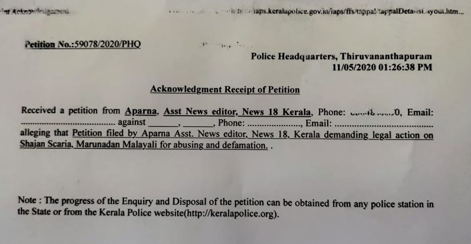 പരാതി മുഖ്യമന്ത്രിക്ക്, സംസ്ഥാന പോലീസ് മേധാവിക്ക്, ഹൈടെക് സെല്ലിന് കൈമാറിയിട്ടുമുണ്ട്"- അപര്ണ ഫേസ്ബുക്കില് പറഞ്ഞു.