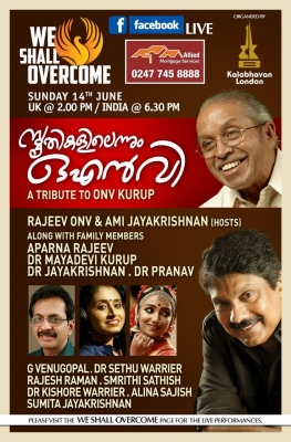 സ്മൃതികളിലെന്നും ഓ എന് വി' ഞായറാഴ്ച്ച 'വീ ഷാല് ഓവര് കം' ലൈവില് ഓ എന് വി കുറുപ്പിന്റെ കുടുംബാംഗങ്ങളും വിശിഷ്ടാതിഥിയായി ഭാവസാന്ദ്ര ഗായകന് ജി വേണുഗോപാലും ഒപ്പം യുകെയിലെ തിരഞ്ഞെടുക്കപ്പെട്ട ഗായകരും ഒത്തുചേരുന്നു