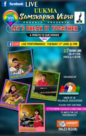 ലോകമെമ്പാടുമുള്ള ആതുരസേവകര്ക്ക് ആദരവ് നല്കുന്നതിനായി യുക്മ സാംസ്കാരിക വേദിയുടെ ആഭിമുഖ്യത്തില് പ്രതിഭാ സമ്പന്നരായ കുട്ടികള് അവതരിപ്പിക്കുന്ന 'ലെറ്റ്സ് ബ്രേക്ക് ഇറ്റ് ടുഗദര് ' എന്ന ലൈവ് കലാവിരുന്നിന് എല്ലാവിധ പ്രോത്സാഹനവും നല്കി വിജയിപ്പിക്കണമെന്ന് യുക്മ പ്രസിഡണ്ട് മനോജ്കുമാര് പിള്ള, ജനറല് സെക്രട്ടറി അലക്സ് വര്ഗീസ് വൈസ് പ്രസിഡന്റ് എബി സെബാസ്റ്റ്യന് എന്നിവര് അഭ്യര്ത്ഥിച്ചു.