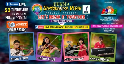 യുക്മ സാംസ്കാരിക വേദിയുടെ ആഭിമുഖ്യത്തില്, കോവിഡ് 19 ന് എതിരായ പ്രവര്ത്തനങ്ങള്ക്ക് മുന്നിരയില് നില്ക്കുന്ന ലോകം മുഴുവനുമുള്ള ആരോഗ്യ പ്രവര്ത്തകര്ക്ക് പിന്തുണയും ആദരവും അര്പ്പിച്ച് കൊണ്ടുള്ള ലൈവ് ടാലന്റ് ഷോയില് നാളെ (ചൊവ്വാഴ്ച) 5 PM ന് (ഇന്ഡ്യന് സമയം രാത്രി 9:30) എത്തുന്നത് വയലിനിലും പിയാനോയിലും രാഗ വിസ്മയം തീര്ക്കുന്ന സഹോദരങ്ങളായ 15 വയസകാരന് കെവിന് ടൈറ്റസും 11 വയസുകാരി എയ്ഡീന് ടൈറ്റസും ഒപ്പം പിയാനോയിലും ഡ്രംസിലും കവിത വിരിയിക്കുന്നസഹോദരങ്ങളായ 14 വയസുകാരന് അര്ണവ് ബിനോയിയും 6 വയസുകാരി അനുവ ബിനോയിയുമാണ്.