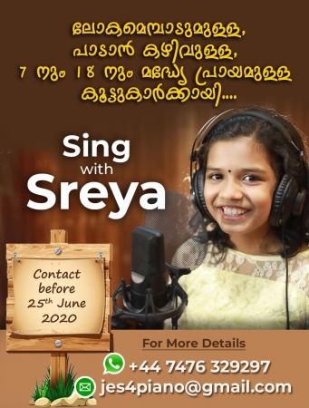 കേരളത്തിന്റെകൊച്ചു വാനമ്പാടിയായ ശ്രേയ ജയദീപിനൊപ്പം ഒരു ഗാനം ആലപിക്കുവാന് 7 നും 18 നും ഇടയില് പ്രായമുള്ള പാടാന് കഴിവുള്ള കുട്ടികളെ ഉള്കൊള്ളിച്ചു ഗാനം തയാറാക്കുന്നു. ലോകത്തിന്റെ ഏതു കോണില് ഇരുന്നു കൊണ്ടാണെങ്കിലും പങ്കു ചേരാവുന്നതാണ്.{ NB:It's Not A Competition }. യാതൊരു വിധ രജിസ്ട്രേഷന് ഫീസുകളും നല്കേണ്ടതില്ല . ഓഡിയോയും വിഡിയോയും സ്മാര്ട്ട് ഫോണ് വഴി ആണ് റെക്കോര്ഡ് ചെയ്യുന്നത് .