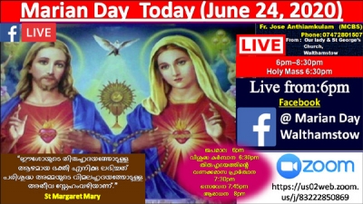 വാല്താംസ്റ്റോ: വാല്താംസ്റ്റോ സെ.മേരീസ് & ബ്ലസ്സഡ് കുഞ്ഞച്ചന് മിഷനില് (ഔവര് ലേഡി ആന്ഡ് സെന്റ് ജോര്ജ് പള്ളിയില്) ഇന്ന് മരിയന് ദിന ശുശ്രൂഷ ഓണ്ലൈനില് ഉണ്ടായിരിക്കുന്നതാണ് .