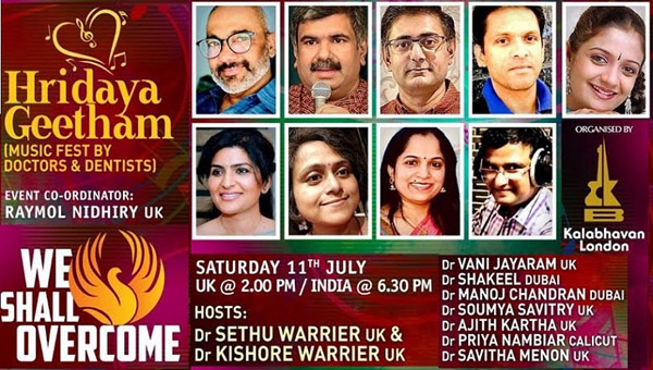 കൊച്ചിന് കലാഭവന് ലണ്ടന് ഈ കോവിഡ് കാലത്ത് ആരംഭിച്ച WE SHALL OVERCOME എന്ന ഫേസ്ബുക് ലൈവ് ക്യാമ്പയിന് നൂറ് ദിനങ്ങള് പിന്നിട്ടു. ഇതിനകം തന്നെ ലോകത്തിന്റെ വിവിധ ഭാഗങ്ങളില് നിന്നായി ഇരുന്നൂറോളം കലാ കാരന്മാര് ഈ പരിപാടിയിലൂടെ രംഗത്തു വന്നു കഴിഞ്ഞു. ആതുര ശുശ്രുഷാ രംഗത്തു പ്രവര്ത്തിക്കുവര് ചേര്ന്നവതരിപ്പിക്കുന്ന പ്രേത്യേക പരിപാടി ഹൃദയഗീതം ഈ ശനിയാഴ്ച്ച ഉച്ചകഴിഞ്ഞു രണ്ടു മണിക്ക്. 'ഹൃദയ ഗീതം' ...സമാനതകളില്ലാത്ത സൗഹൃദത്തിന്റെ സംഗീത സന്ദേശം ... ഒരുമയുടെ സന്ദേശം പകര്ന്നുകൊണ്ട് ലോകത്തിന്റെ വിവിധ ഭാഗങ്ങളില് നിന്നുള്ള ഗായകരായ മലയാളി ഡോക്ടര്മാര് ഒന്നുചേര്ന്ന് ഒരു സംഗീത പരിപാടിക്കു രൂപം കൊടുക്കുന്നു . ദുര്ഘടമായ ജീവിത സന്ധിയിലൂടെ കടന്നു പോകുന്ന ഈ കാല ഘട്ടത്തില്, മനുഷ്യ ഹൃദയങ്ങളില് സ്നേഹത്തിന്റെയും സൗഹൃദത്തിന്റെയും സ്വാന്തനം ഊട്ടി ഉറപ്പിക്കുന്ന ഈ സംഗീതവിരുന്നിന്റെ ആശയം ലണ്ടനില് നിന്നുള്ള ഡോക്ടര് സേതു വാര്യരുടേതാണ്. ഡോക്ടര് സേതുവും ഡോക്ടര് കിഷോര് വാര്യരും ചേര്ന്നാണ് ഈ സംഗീത വിരുന്ന് അവതരിപ്പിക്കുന്നത്.