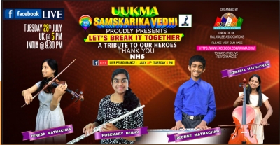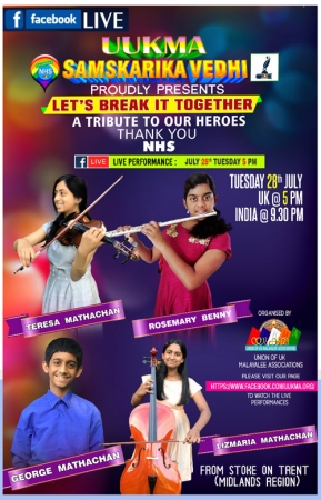 യുക്മ സാംസ്കാരിക വേദിയുടെ ആഭിമുഖ്യത്തില്, കോവിഡ് 19 ന് എതിരായ പ്രവര്ത്തനങ്ങള്ക്ക് മുന്നിരയില് നില്ക്കുന്ന ലോകം മുഴുവനുമുള്ള ആരോഗ്യ പ്രവര്ത്തകര്ക്ക് പിന്തുണയും ആദരവും അര്പ്പിച്ച് കൊണ്ടുള്ള ലൈവ് ടാലന്റ് ഷോ 'LET'S BREAK IT TOGETHER' ല് നാളെ (ചൊവ്വ) 5 PM ന് (ഇന്ഡ്യന് സമയം രാത്രി 9.30) സംഗീതത്തിന്റെ വാദ്യ വിസ്മയം തീര്ക്കാന് എത്തുന്നത് സ്റ്റോക്കില് നിന്നുള്ള സഹോദരങ്ങള് തെരേസ മാത്തച്ചനും, ജോര്ജ്ജ് മാത്തച്ചനും, ലിസ് മരിയ മാത്തച്ചനും ഒപ്പം കൂട്ടുകാരി റോസ് മേരി ബെന്നിയും.