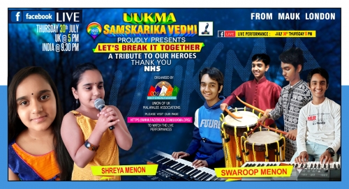 യുക്മ സാംസ്കാരിക വേദിയുടെ ആഭിമുഖ്യത്തില്, കോവിഡ് 19 ന് എതിരായ പ്രവര്ത്തനങ്ങള്ക്ക് മുന്നിരയില് നില്ക്കുന്ന ലോകം മുഴുവനുമുള്ള ആരോഗ്യ പ്രവര്ത്തകര്ക്ക് പിന്തുണയും ആദരവും അര്പ്പിച്ച് കൊണ്ടുള്ള ലൈവ് ടാലന്റ് ഷോ 'LET'S BREAK IT TOGETHER' ല് ഇന്ന് (വ്യാഴം) 5 PM ന് (ഇന്ഡ്യന് സമയം രാത്രി 9.30) പ്രേക്ഷക മനസ്സുകള് കീഴടക്കുവാന് എത്തുന്നത് ലണ്ടനിലെ ഈസ്റ്റ്ഹാമില് നിന്നുള്ള സഹോദരങ്ങള് സ്വരൂപ് മേനോനും ശ്രേയ മേനോനുമാണ്.
