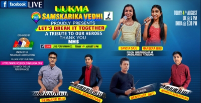 യുക്മ സാംസ്കാരിക വേദിയുടെ ആഭിമുഖ്യത്തില്, കോവിഡ് 19 ന് എതിരായ പ്രവര്ത്തനങ്ങള്ക്ക് മുന്നിരയില് നില്ക്കുന്ന ലോകം മുഴുവനുമുള്ള ആരോഗ്യ പ്രവര്ത്തകര്ക്ക് പിന്തുണയും ആദരവും അര്പ്പിച്ച് കൊണ്ടുള്ള ലൈവ് ടാലന്റ് ഷോ 'LET'S BREAK IT TOGETHER' ല് ഇന്ന് ( ചൊവ്വ) 5 PM ന് (ഇന്ഡ്യന് സമയം രാത്രി 9.30) ആസ്വാദകര്ക്ക് മുന്നിലെത്തുന്നത് ആറ് അതുല്യ പ്രതിഭകളാണ്. എര്ഡിംഗ്ടണില് നിന്നുള്ള സഹോദരങ്ങളായ ബര്ണാര്ഡ് ബിജു, ബനഡിക്ട് ബിജു എന്നിവരും സാന്സിയ സാജു, മറീന ബിജു, ബര്മിംഗ്ഹാമില് നിന്നുള്ള മറ്റൊരു സഹോദരങ്ങളായ ആകാഷ് സെബാസ്റ്റ്യനും ആഷിഷ് സെബാസ്റ്റ്യനുമാണ്.