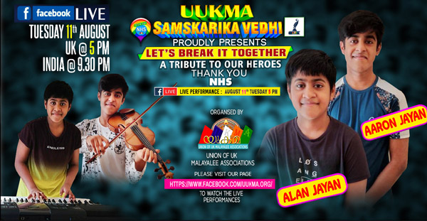 യുക്മ സാംസ്കാരിക വേദിയുടെ ആഭിമുഖ്യത്തില്, കോവിഡ് 19 ന് എതിരായ പ്രവര്ത്തനങ്ങള്ക്ക് മുന്നിരയില് നില്ക്കുന്ന ലോകം മുഴുവനുമുള്ള ആരോഗ്യ പ്രവര്ത്തകര്ക്ക് പിന്തുണയും ആദരവും അര്പ്പിച്ച് കൊണ്ടുള്ള ലൈവ് ടാലന്റ് ഷോ 'LET'S BREAK IT TOGETHER' ല് നാളെ (ചൊവ്വ) 5 PM ന് (ഇന്ഡ്യന് സമയം രാത്രി 9.30) ആസ്വാദകര്ക്ക് മുന്നിലെത്തുന്നത് മാഞ്ചസ്റ്ററില് നിന്നുള്ള ആരണ് ജയന്, അലന് ജയന് സഹോദരങ്ങളാണ്. സഹോദരങ്ങളില് ജ്യേഷ്ഠനായ ആരണ് വയലിനില് സ്നേഹ സംഗീതമുണര്ത്തുമ്പോള് ഇളയ സഹോദരന് അലന് കീബോര്ഡില് മാസ്മരിക സംഗീതത്തിന്റെ അഴകൊരുക്കും.