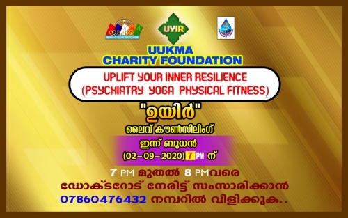 യുക്മ ചാരിറ്റി ഫൗണ്ടേഷന്റെ ആഭിമുഖ്യത്തില് 'ഉയിര്' ന്റെ ലൈവ് കൗണ്സിലിംഗ് ഇന്ന് (ബുധന്) വൈകുന്നേരം 7 PM മുതല് യുക്മ പേജിലൂടെ ഉണ്ടായിരിക്കുന്നതാണ്. കഴിഞ്ഞ 3 ആഴ്ചകളിലായി വളരെയധികം പേര് തങ്ങളുടെ ചെറുതും വലുതുമായ മാനസിക പ്രശ്നങ്ങള്ക്ക് പരിഹാരം നേടിയെന്നത് ഈ പ്രോഗ്രാമിന്റെ പ്രസക്തി വര്ദ്ധിപ്പിക്കുന്നു. യുക്മ ചാരിറ്റി ഫൗണ്ടേഷന് യുകെ മലയാളി സമൂഹത്തിലെ കുടുംംബങ്ങളില് ഉണ്ടാകുന്ന ചെറുതും വലുതുമായ മാനസികാരോഗ്യ പ്രശ്നങ്ങള്ക്ക് പരിഹാരം കാണുവാനും അതുവഴി കുടുംബങ്ങളിലും കുടുംബ ബന്ധങ്ങളിലും പുത്തനുണര്വ് ഉണ്ടാകുവാന് ലക്ഷ്യം വച്ചു കൊണ്ട്ട് ആരംഭിച്ച പരിപാടിക്ക് വലിയ പിന്തുണയാണ് ലഭിച്ചുകൊണ്ടിരിക്കുന്നത്.