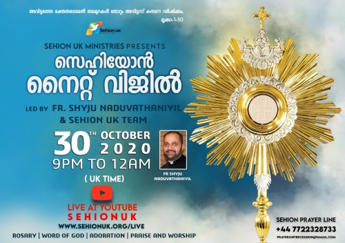 WWW.SEHIONUK.ORG/LIVE എന്ന വെബ്സൈറ്റിലും സെഹിയോന് യൂട്യൂബ് , ഫേസ്ബുക്ക് പേജുകളിലും ലൈവ് ആയി കാണാവുന്നതാണ്. ജപമാല വചന പ്രഘോഷണം, ആരാധന എന്നിവ ഉള്പ്പെടുന്ന നൈറ്റ് വിജിലിലേക്ക് സെഹിയോന് യുകെ മിനിസ്ട്രി യേശുനാമത്തില് ഏവരെയും ക്ഷണിക്കുന്നു.