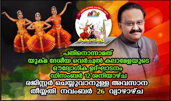 യുക്മ ദേശീയ വെര്ച്വല് കലാമേളയുടെ ഔദ്യോഗീക ഉദ്ഘാടനം ഡിസംബര് 12ന് 26 വരെ രജിസ്റ്റര് ചെയ്യാം