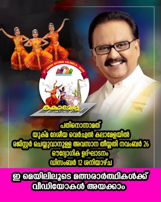 പതിനൊന്നാമത് യുക്മ ദേശീയ കലാമേള ഡിസംബര് 12 ശനിയാഴ്ച എസ് പി ബി വെര്ച്വല് നഗറില് ഉദ്ഘാടനം ചെയ്യപ്പെടും. കോവിഡ് മഹാമാരിയുടെ പശ്ചാത്തലത്തില്, സാങ്കേതികവിദ്യകളുടെ എല്ലാ സാദ്ധ്യതകളും ഉപയോഗപ്പെടുത്തിക്കൊണ്ടുള്ള വെര്ച്വല് പ്ലാറ്റ്ഫോം രൂപകല്പ്പന ചെയ്തുകഴിഞ്ഞു. യശഃശരീരനായ ഇന്ത്യന് സംഗീത ചക്രവര്ത്തി എസ് പി ബാലസുബ്രഹ്മണ്യത്തിന് ആദരവ് അര്പ്പിച്ചുകൊണ്ട് അദ്ദേഹത്തിന്റെ നാമധേയത്വത്തിലുള്ള വെര്ച്വല് നഗറില് ദേശീയമേളക്ക് തിരിതെളിയുമ്പോള്, അത് യുക്മയ്ക്കും ലോക പ്രവാസി മലയാളി സമൂഹത്തിനും ചരിത്ര നിമിഷമാകും.